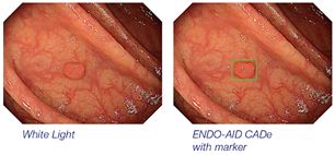 ENDO-AID CADe is an application for computer-aided detection powered by AI which runs on ENDO-AID. It uses a complex algorithm via a neural network developed and trained by Olympus. With this new application, the system’s sophisticated machine learning can alert the endoscopist in real time when a suspected colonic lesion (such as a polyp, malignant neoplasm or adenoma) appears on the screen.