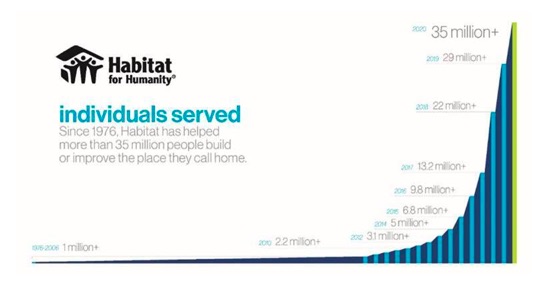 The 5.9 million people who accessed new or improved housing through new home construction, rehabilitation, incremental improvements and repairs helped the organization reach the milestone of 35 million people served since its founding in 1976.