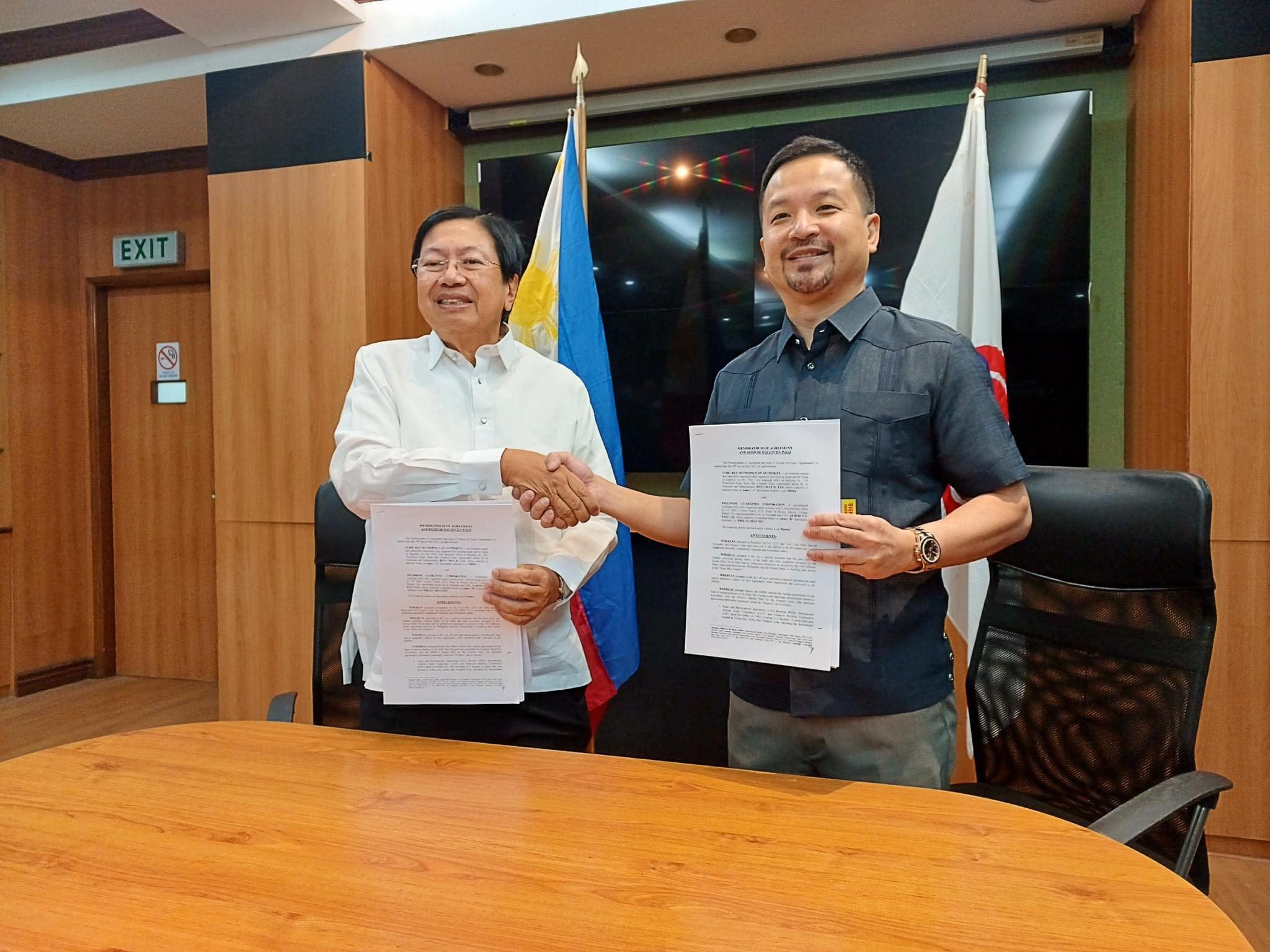 SBMA Chairman and Administrator Jonathan D. Tan signs a Memorandum of Agreement (MOA) and the Deed of Dacion En Pago with Philippine Guarantee Corporation (PhilGuarantee) President and CEO Alberto E. Pascual at the Board Room of the Administration Building on Thursday.